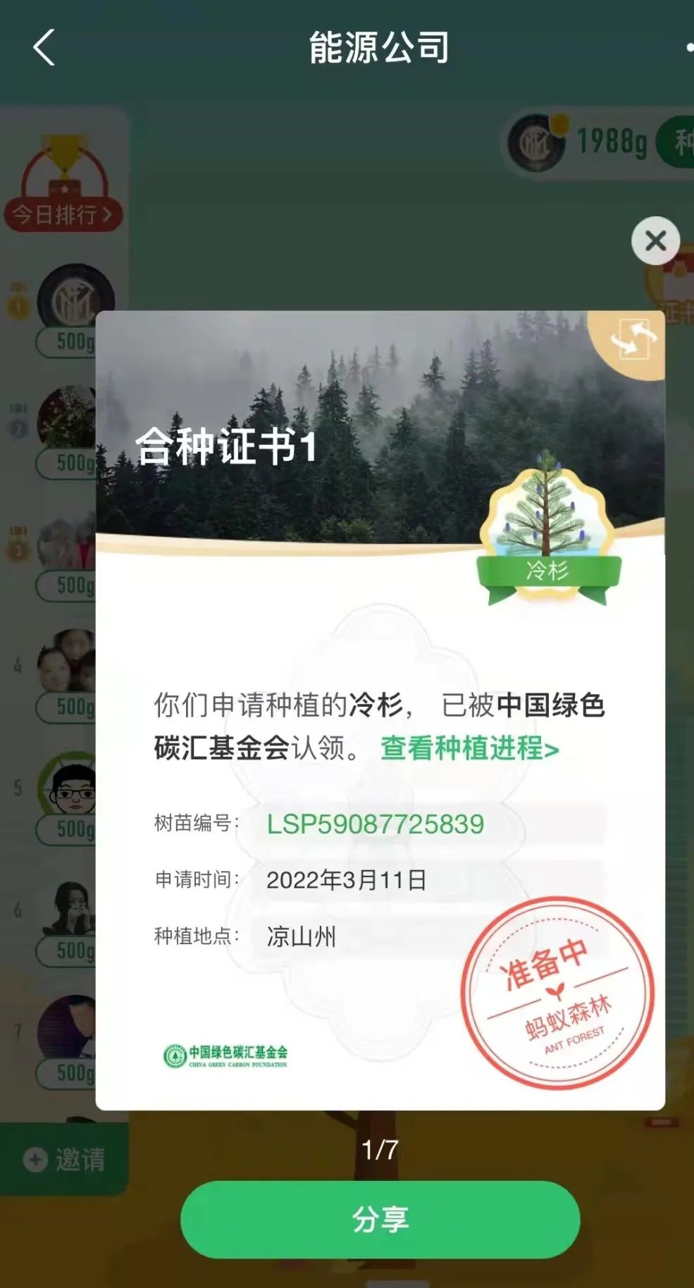 “一花一草皆生命,一枝一葉總關情?!痹缭?019年起,公司就通過支付寶螞蟻森林組建了一只“能源公司云種樹小隊”,如今隊伍人數越來越壯大,已有59位隊員,截止目前,在酒泉、大理、邯鄲等地,種下了冷杉、側柏、云杉、胡楊等7棵大樹。3月11日,在小伙伴的共同努力下,我們又種下了一棵冷杉樹,該樹被中國綠色碳匯基金會認領,將種植到涼山州地區(qū)。